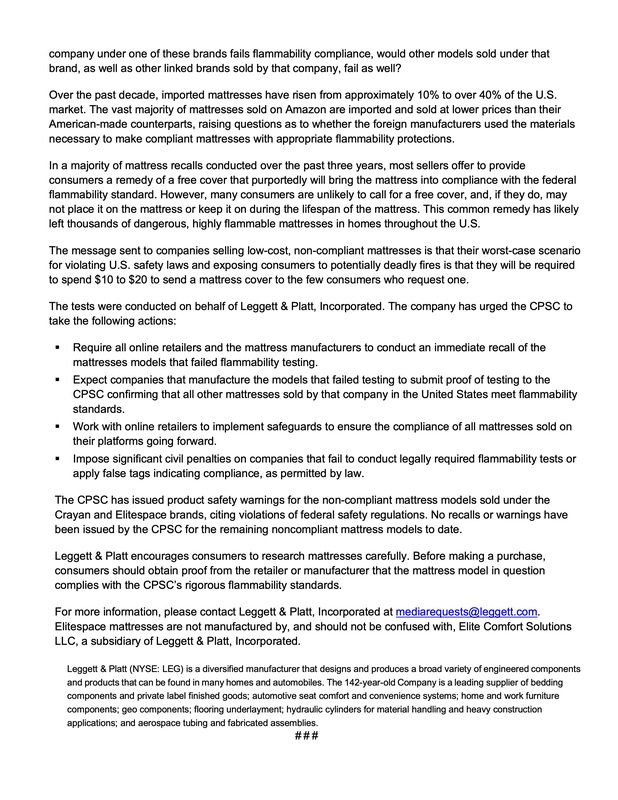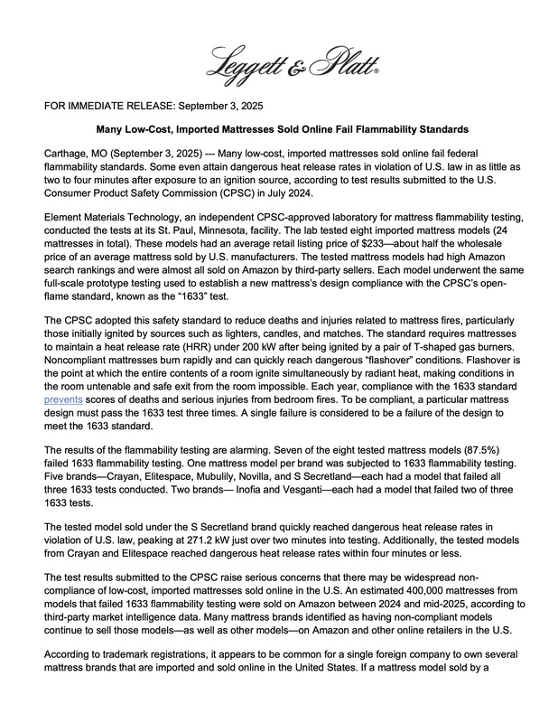 Subsequently, Leggett & Platt, a public company that has served the mattress category since 1883, performed its own tests of some of the most popular mattresses on Amazon. Their published findings are shown below. Critically, of the 8 mattresses that were tested, 7 of them failed 1633 flammability testing. According to Leggett & Platt, "each of the tested mattress models had high Amazon search rankings and were almost all sold on Amazon by third-party sellers. Each model underwent the same full-scale prototype testing used to establish a new mattress’s design compliance with the CPSC’s open-flame standard, known as the '1633' test."