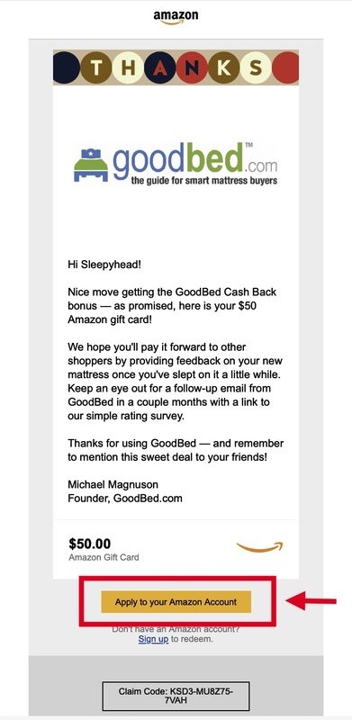 In the case of an Amazon gift card, your reward will come in an email from Amazon that also includes a message from GoodBed. As far as we know, Amazon gift cards sent on our behalf will always come from this email address: gc-orders@gc.email.amazon.com