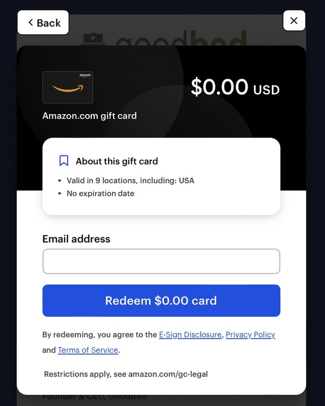 We have a separate guide that explains more about receiving Amazon gift cards from GoodBed.