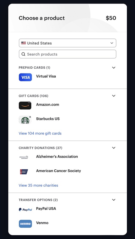- Gift cards for hundreds of popular stores and restaurants (eg, Amazon, Walmart, Target, Starbucks, etc.)