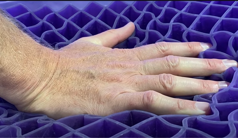 Purple's gel grid does not do that. Instead, when you press down on it, it holds its shape for a long time until eventually the grid collapses to the side -- not directly down. This also means that the gel grid AROUND your hand does not collapse at all. The grid buckles more than compresses.
